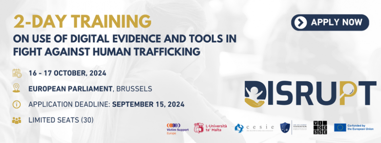 We are pleased to invite you to the first training event of the DISRUPT project, focused on enhancing the use of digital evidence in the fight against human trafficking. The training will take place on Wednesday 16 and Thursday 17 October 2024 at the European Parliament in Brussels.