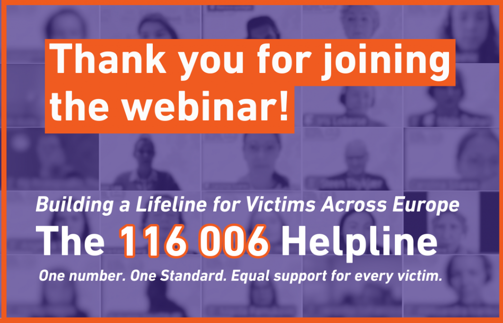 On December 9th, Victim Support Europe hosted a successful webinar, Building a Lifeline for Victims Across Europe: The 116006 Helpline. With more than 130 registered participants, the event brought together experts from across 38 countries to share practical guidance, proven models, and real-world experience on building accessible, high-quality victim helplines. In a timely turn of events, just one day after the webinar, the amendments to the Victims’ Rights Directive were officially adopted. Under the new Directive, Member States will be required to put in place 116006 victims’ helpline, providing victims with immediate, clear information and emotional support, and making it simpler to report crime with the help of victim support organisations. This legislative milestone underscored the importance and relevance of the discussions held during the event.