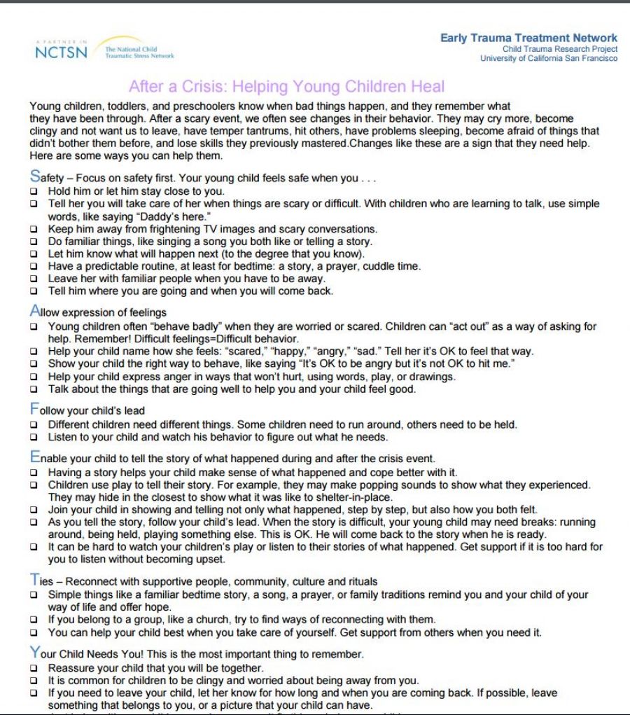 After a crisis: Helping young children heal July 14, 2016 Tips from the Early Trauma Treatment Network Continue reading
