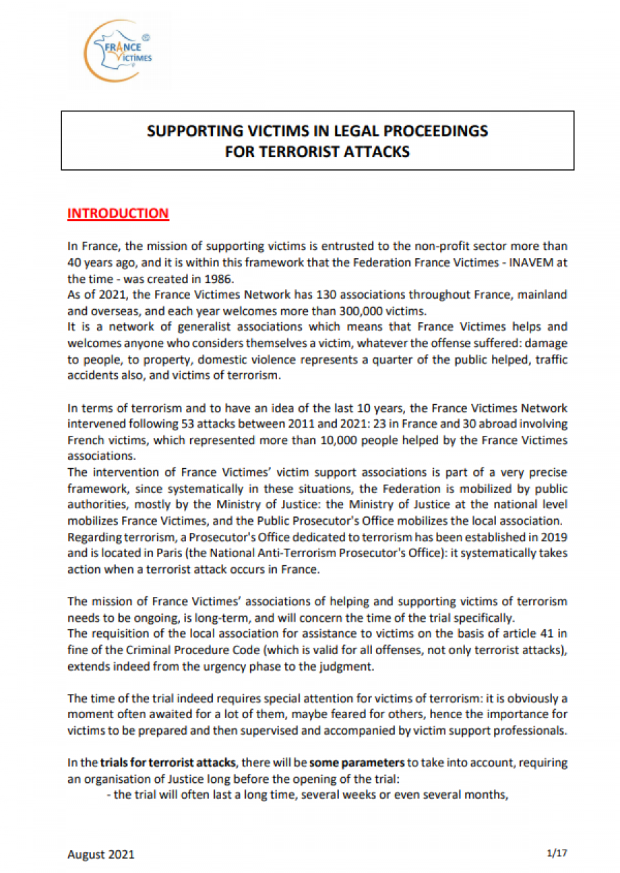 Supporting victims in legal proceedings for terrorist attacks September 1, 2021 France Victimes published this report, which includes information, lessons learned and best... Continue reading