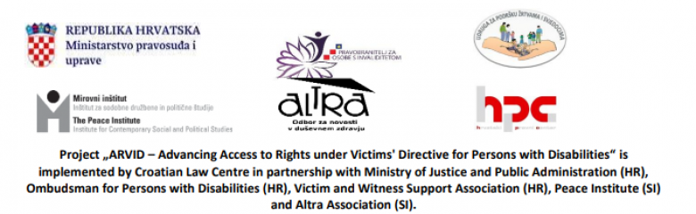 The ARVID project was financed by the European Union under the Justice Programme, and was implemented in Croatia and Slovenia. The project coordinator was the Croatian Law Centre; Croatian partners were the Ministry of Justice and Public Administration, the Ombudswoman for Persons with Disabilities and the NGO Victim and Witness Support Service Croatia, while Slovenian partners were NGOs Peace Institute and ALTRA.