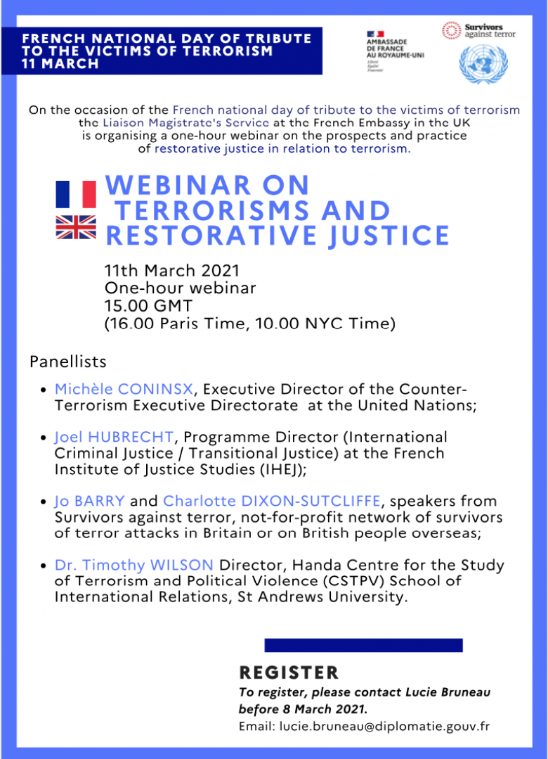 On the occasion of the French national day of tribute to the victims of terrorism on 11 March 2021, the Liaison Magistrate’s Service at the French Embassy in the United Kingdom is organising a one-hour webinar on the prospects and practice of restorative justice in relation to terrorism.